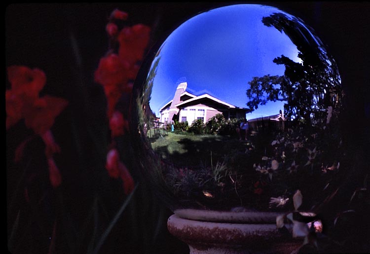 John's home reflected in a gazing ball.
