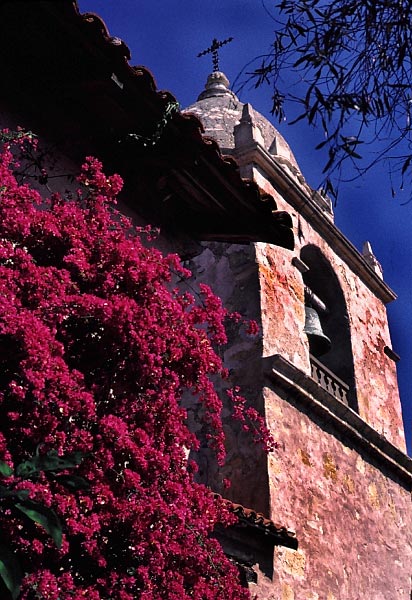 "Old Mission with Red Bougainvillaea"
